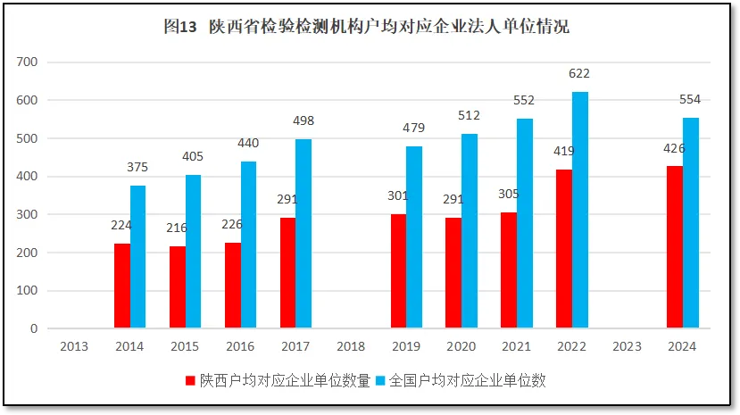 由图13可见,12年来,陕西省检验检测机构户均对应的企业法人单位数量总体有所增加,2024年陕西省检验检测机构户均对应企业法人单位426个,比全国平均数低了128个。以2024年度的统计数据计,陕西地区企业法人单位数量超过77.5万个,位居全国第14位,排名居于中等水平。这说明陕西地区检验检测机构存量较大,相对于陕西省的企业法人单位来说,检验检测机构数量多了一些,市场竞争较为激烈,检验检测机构的发展困难不小。