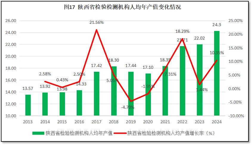 人均年产值是衡量检验检测机构经营运行质量的直观指标。2024年度,陕西省检验检测机构人均年产值24.3万元,离30万元行业温饱线还比较远,更没有达到2024年度全国31.45万元的平均值,排名居于全国第16位(由高到低排序),较2023年度排名提升了1位。这表明陕西地区检验检测机构经营状况一般,劳动生产率相对偏低,机构盈利能力不足,但这种情况正在逐步好转之中。过去12年陕西省检验检测机构人均年产值的变化情况,如图17所示。