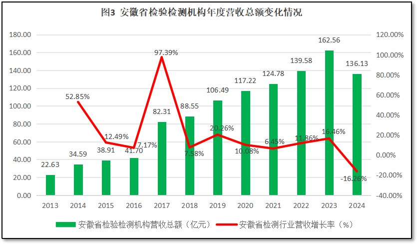 由图3可见,2023年之前,安徽省检验检测机构营收总额总体保持快速增长,2023年末安徽省检验检测行业年度营收总额达到162.56亿元,是2013年的7.18倍,增幅很大。但2024年,安徽省检验检测机构营收总额出现大幅下降,仅有136.13亿元,较2023年度净减少约26.4亿元。从增长率曲线来看,除了头两年因统计数据质量不高导致曲线波动巨大之外,2015-2024年安徽省检验检测机构营收总额年均增速为17.34%,其中在2017年出现了97.39%的极速增长,2024年出现-16.26%的大幅下跌。可以说,安徽省的检验检测行业经过多年规模、效益“双增长”的发展后,2024年出现了规模、效益“双下降”的新形势。