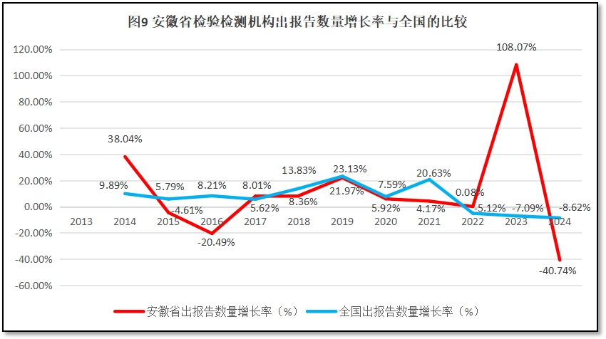 安徽省检验检测机构出具报告数量的增长率与全国检验检测机构出具报告增长率的比较如图9所示。